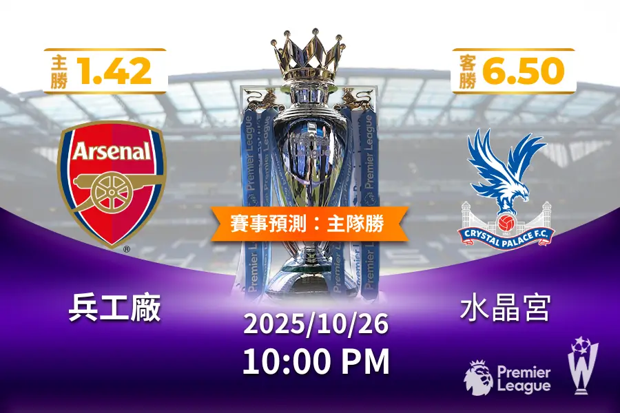 英超 運彩分析與預測》兵工廠 vs 水晶宮 2025年10月26日 22:00