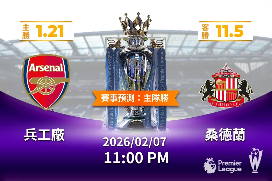 英超 | 兵工廠 vs 桑德蘭 2026 年 02 月 07 日
