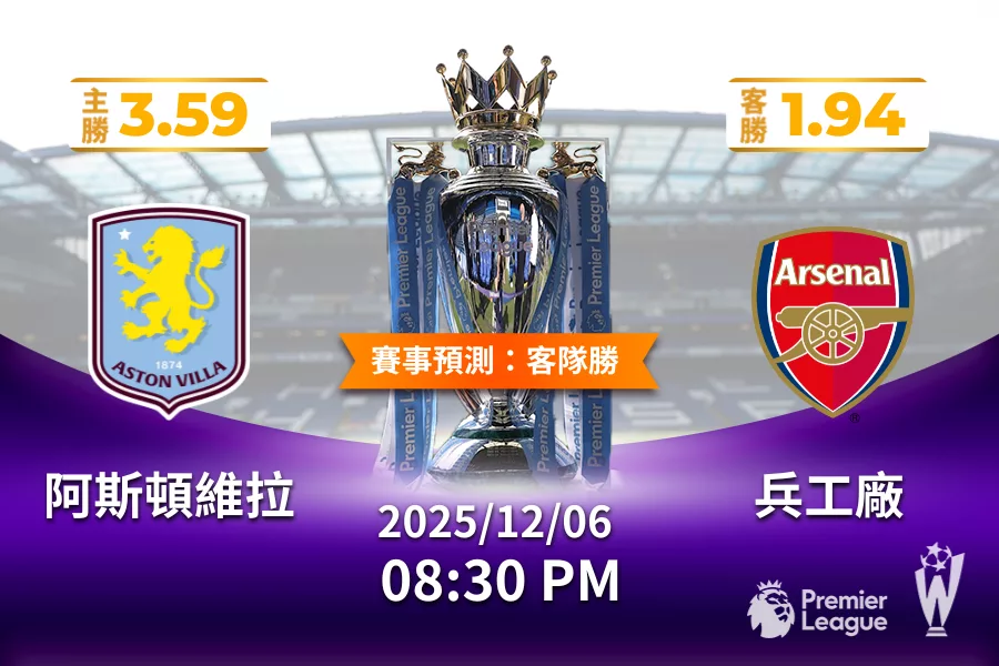 英超 | 阿斯頓維拉 vs 兵工廠 2025 年 12 月 06 日