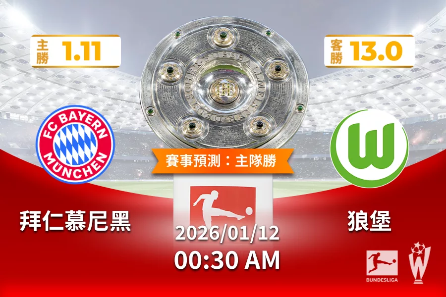 2026年01月 12日 德甲 拜仁慕尼黑 vs 狼堡 賠率