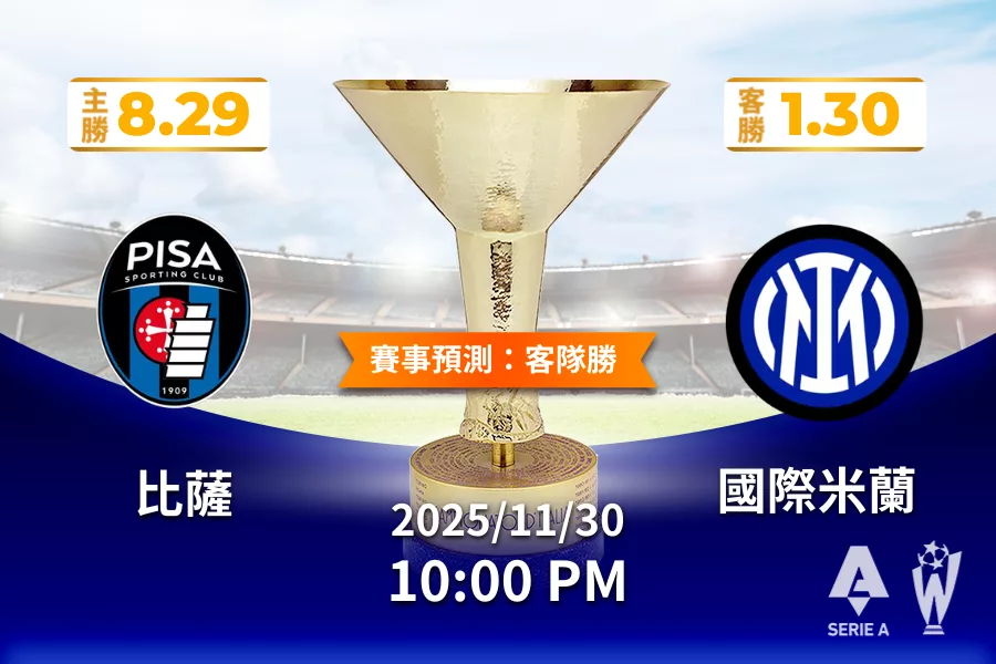 國際米蘭平均場均進球數維持在 2.17,聯賽火力排名前段,並有 75% 的客場進球率;比薩則場均僅 0.83 球,失球超過 1.3 球,整體轉換率偏低,若面對高壓逼搶容易被壓迫至後場。綜合雙方實際能力與過往交手情況,國米再次取勝的機率依然偏高。